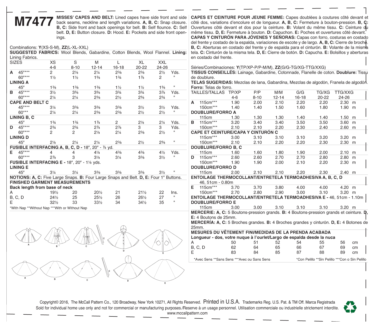 Le patron McCall's n°7477 est conçu pour réaliser des capes élégantes et des ceintures assorties, idéales pour les couturières souhaitant créer des pièces sophistiquées et polyvalentes. Ce modèle propose des capes doublées avec des coutures latérales sur le devant et le dos, offrant des variations d'encolure et de longueur pour personnaliser chaque pièce selon vos préférences.